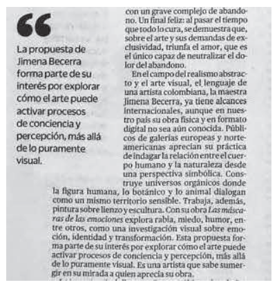 The proposal of Jimena Becerra is part of her interest in exploring how art can activateprocesses of awareness and perception beyond the purely visual.”Within the field of abstract realism and visual art, the language of Colombian artist JimenaBecerra already has international reach, even though in her home country her physical anddigital work is not yet widely known. Audiences in European and North American galleriesappreciate her practice of investigating the relationship between the human body andnature from a symbolic perspective.She constructs organic universes where the human figure, the botanical, and the animalengage in dialogue as part of the same sensitive territory. She also works with painting oncanvas and sculpture. With her work The Masks of Emotions, she explores anger, fear,humor, among other emotional states, as a visual investigation of emotion, identity, andtransformation.This proposal forms part of her broader interest in exploring how art can activate processesof consciousness and perception beyond the purely visual. She is an artist capable ofdrawing the viewer deeply into her perspective and experience of the work.